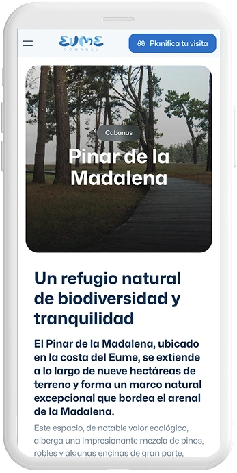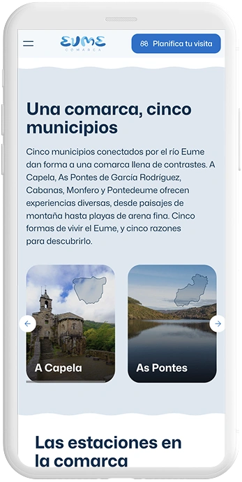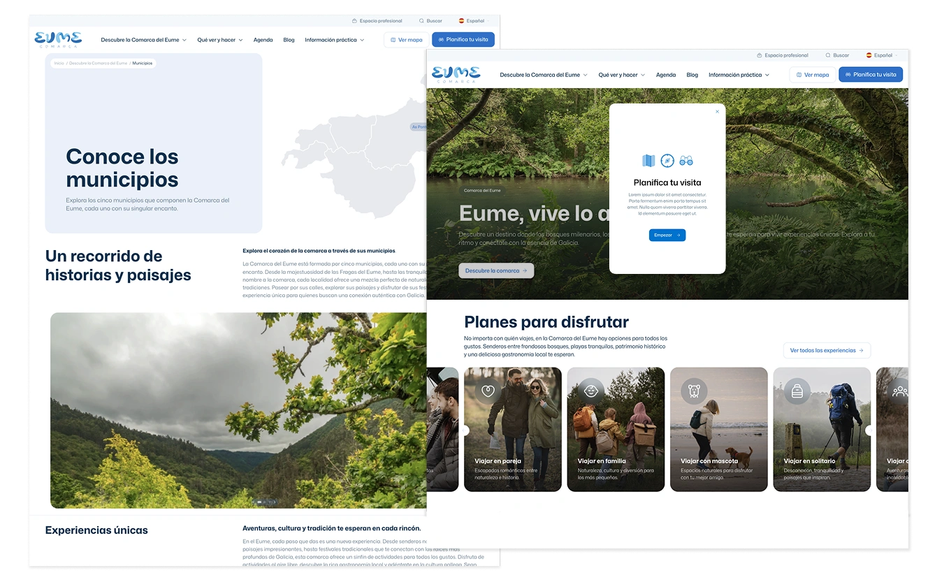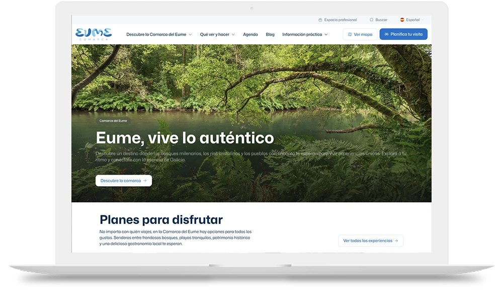 La Comarca del Eume carecía de una plataforma digital centralizada que reuniera los atractivos naturales, culturales y turísticos, así como información útil para visitantes (alojamientos, rutas, calendario de eventos). Se necesitaba una web nueva que organizara todo esto de forma clara y accesible.